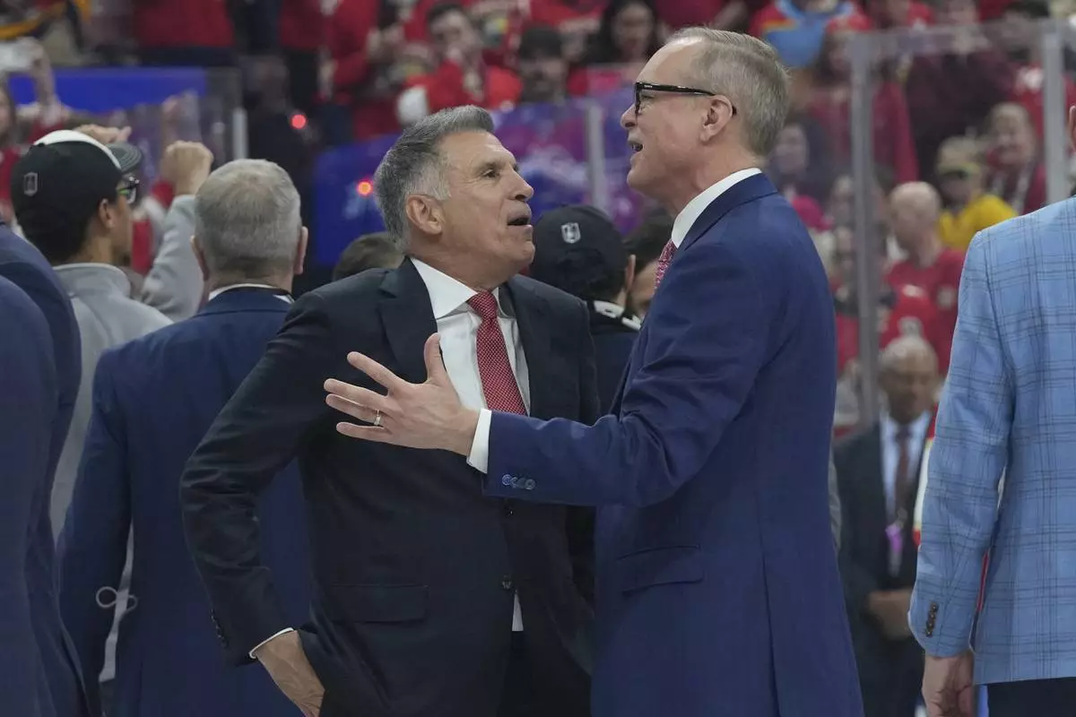Vincent Viola, owner of the Florida Panthers, left, speaks to head coach Paul Maurice after the team defeated the Edmonton Oilers in Game 6 of the NHL hockey Stanley Cup Final Tuesday, June 17, 2025, in Sunrise, Fla. (AP Photo/Lynne Sladky)