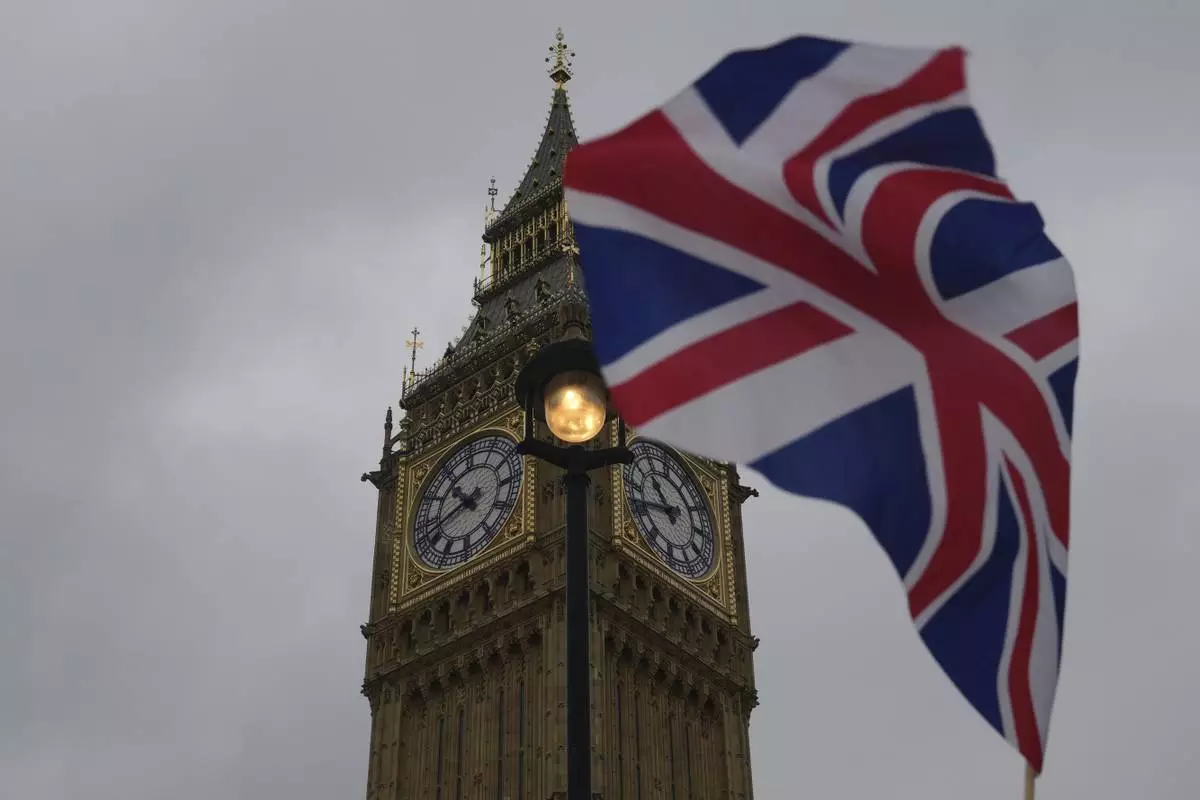 FILE - A Union flag is displayed outside the Houses of Parliament, in London, Thursday, May 23, 2024.(AP Photo/Kin Cheung, File)