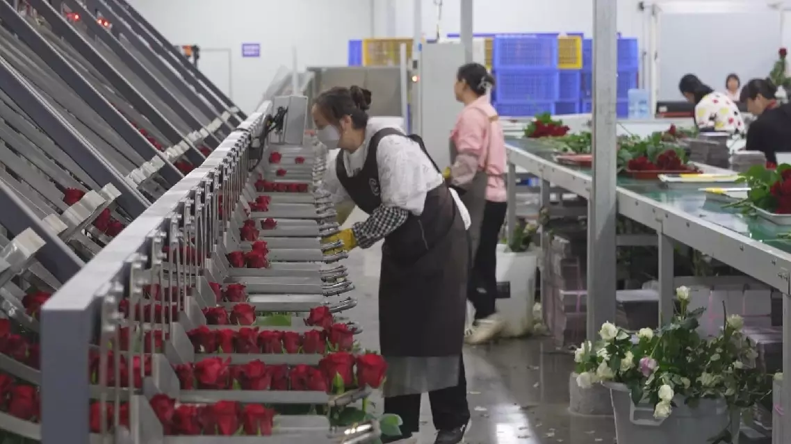 In Kunming, Yunnan's provincial capital, workers at a flower-packing facility are still working even at 22:00, carefully packaging rose stems destined for the Kazakh market.