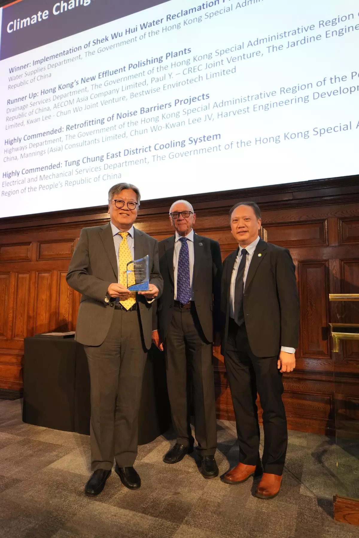 1. The winner award for the Climate Change Initiative category was received by the Water Supplies Department (WSD) for the implementation of Shek Wu Hui Water Reclamation Plant. In the construction and operation of Hong Kong's first large-scale regional water reclamation plant, the WSD worked with the contractor through the NEC mechanism to develop an innovative and cost-effective fully automated reclaimed water production solution that saves energy and helps reduce carbon emissions. The facility supplies water for non-potable uses in Northern District and nearby new development areas. With the production process remaining unaffected by extreme weather, it not only conserves precious water resources but also enhances the resilience of Hong Kong's water resources portfolio, thus further improving the stability of the city's water resources.