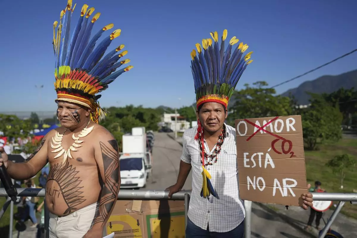 Indigenous demonstrators holds a sign that reads in Portuguese "Love, CO2 is in the air" to protest the auction of dozens of oil blocks, including blocks near the mouth of the Amazon River, in Rio de Janeiro, Tuesday, June 17, 2025. (AP Photo/Silvia Izquierdo)