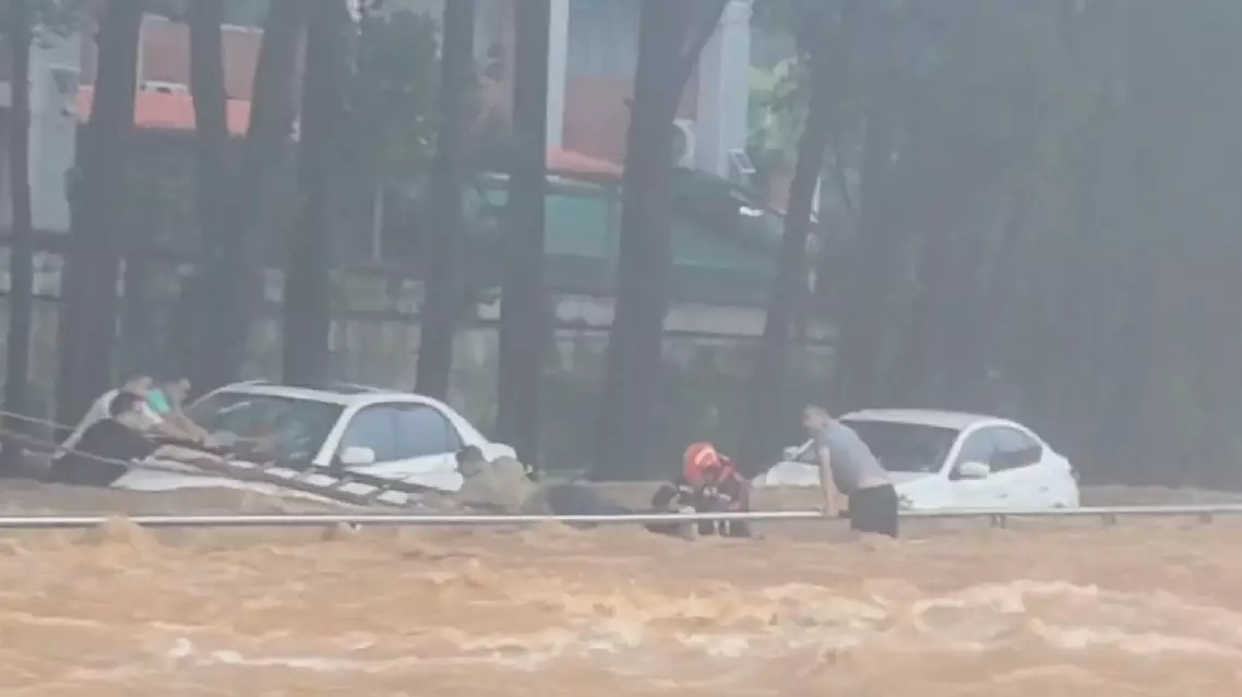Firefighters rushed to rescue many people stuck in high water after the rain flooded streets and left people trapped.