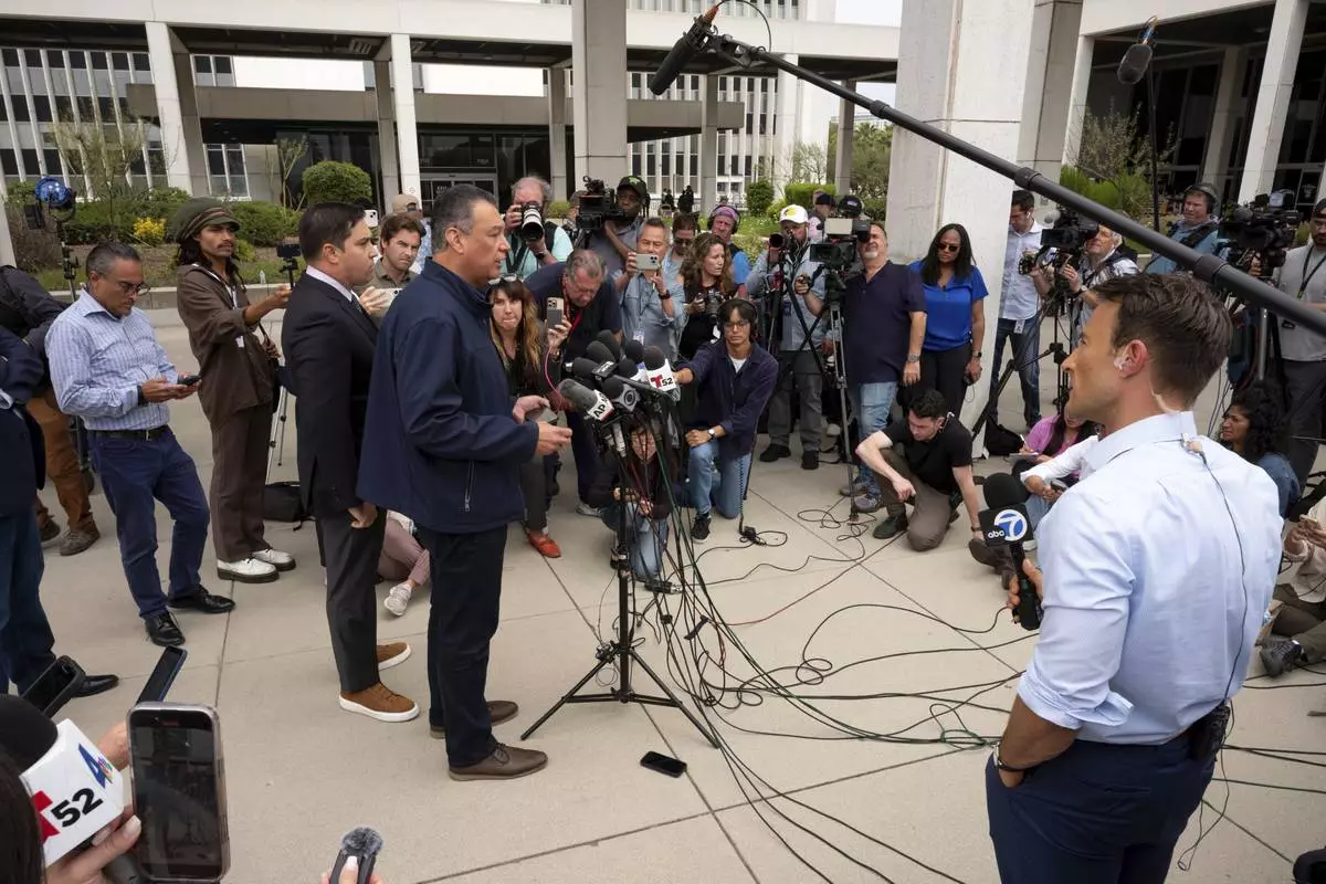 Sen. Alex Padilla, D-Calif., makes a brief statement to the media after leaving the Federal Building after he was forcibly removed from a news conference with Homeland Security Secretary Kristi Noem in Los Angeles on Thursday, June 12, 2025. (David Crane/The Orange County Register via AP)