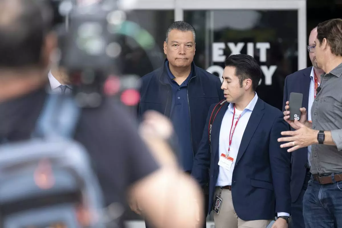 Sen. Alex Padilla, D-Calif., emerges from the Federal Building after he was forcibly removed from a news conference with Homeland Security Secretary Kristi Noem in Los Angeles on Thursday, June 12, 2025. (David Crane/The Orange County Register via AP)