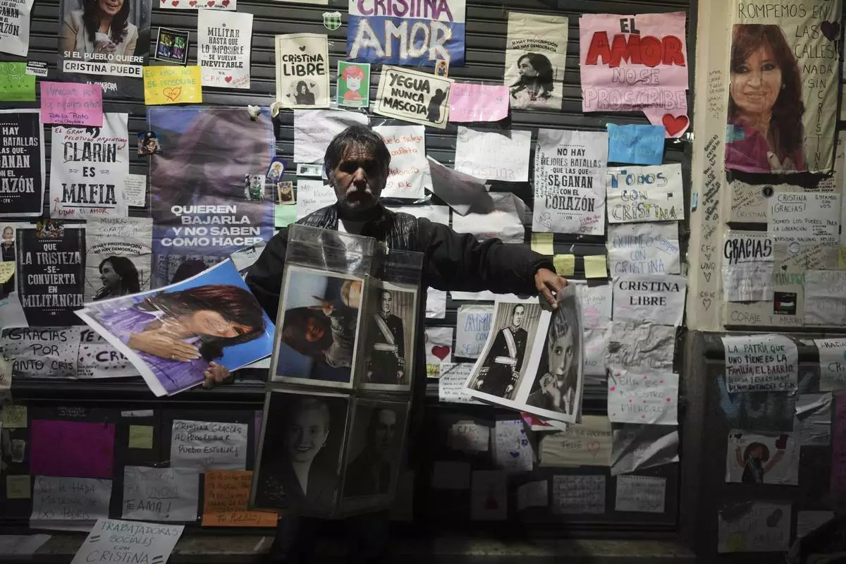A vendor hawks pictures of former President Cristina Fernandez outside her home, after a federal court granted her request to serve a six-year prison sentence for corruption at her home, in Buenos Aires, Argentina, Tuesday, June 17, 2025. (AP Photo/Natacha Pisarenko)