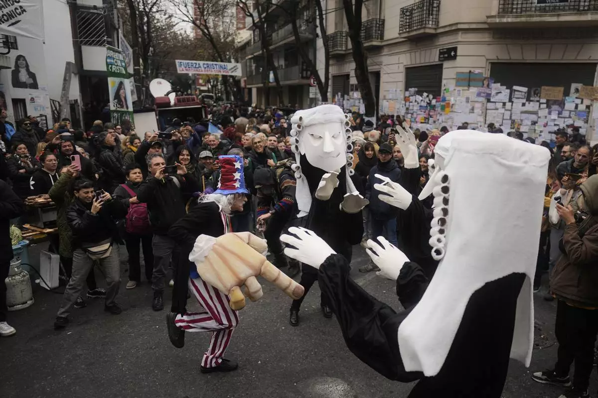 Supporters of Argentina's former President Cristina Fernandez gather outside her home one week after the nation's Supreme Court upheld her corruption conviction in Buenos Aires, Argentina, Tuesday, June 17, 2025. (AP Photo/Natacha Pisarenko)