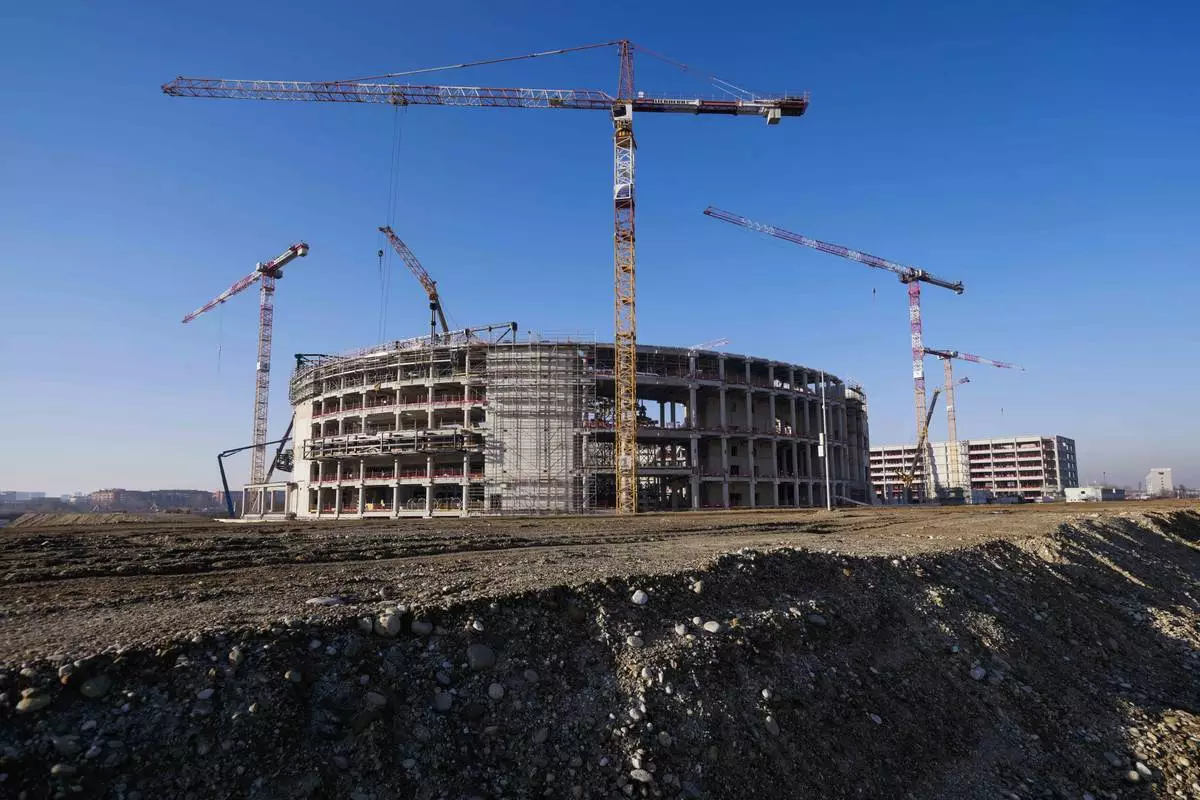 FILE - The Milano Santagiulia Ice Hockey Arena for the Milan Cortina 2026 Winter Olympics is seen under construction in Assago, Italy, Jan. 15, 2025. (AP Photo/Luca Bruno, File)