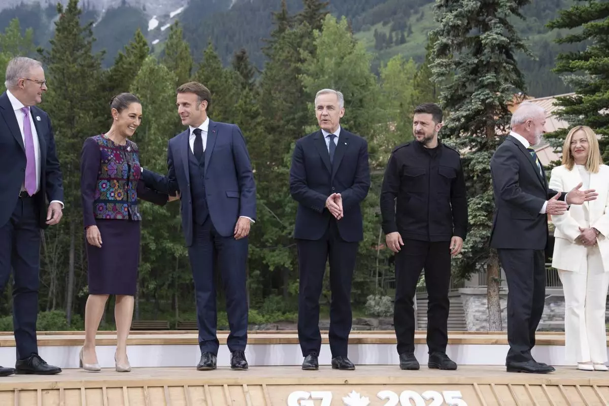 Australia's Prime Minister Anthony Albanese, from left, President of Mexico Claudia Sheinbaum, President of France Emmanuel Macron, Canada's Prime Minister Mark Carney, President of Ukraine Volodymyr Zelenskyy, President of Brazil Luiz Inacio Lula da Silva and Italy's Prime Minister Giorgia Meloni during a family photo at the G7 leaders' summit in Kananaskis, Alberta, Tuesday, June 17, 2025. (Stefan Rousseau/Pool Photo via AP)