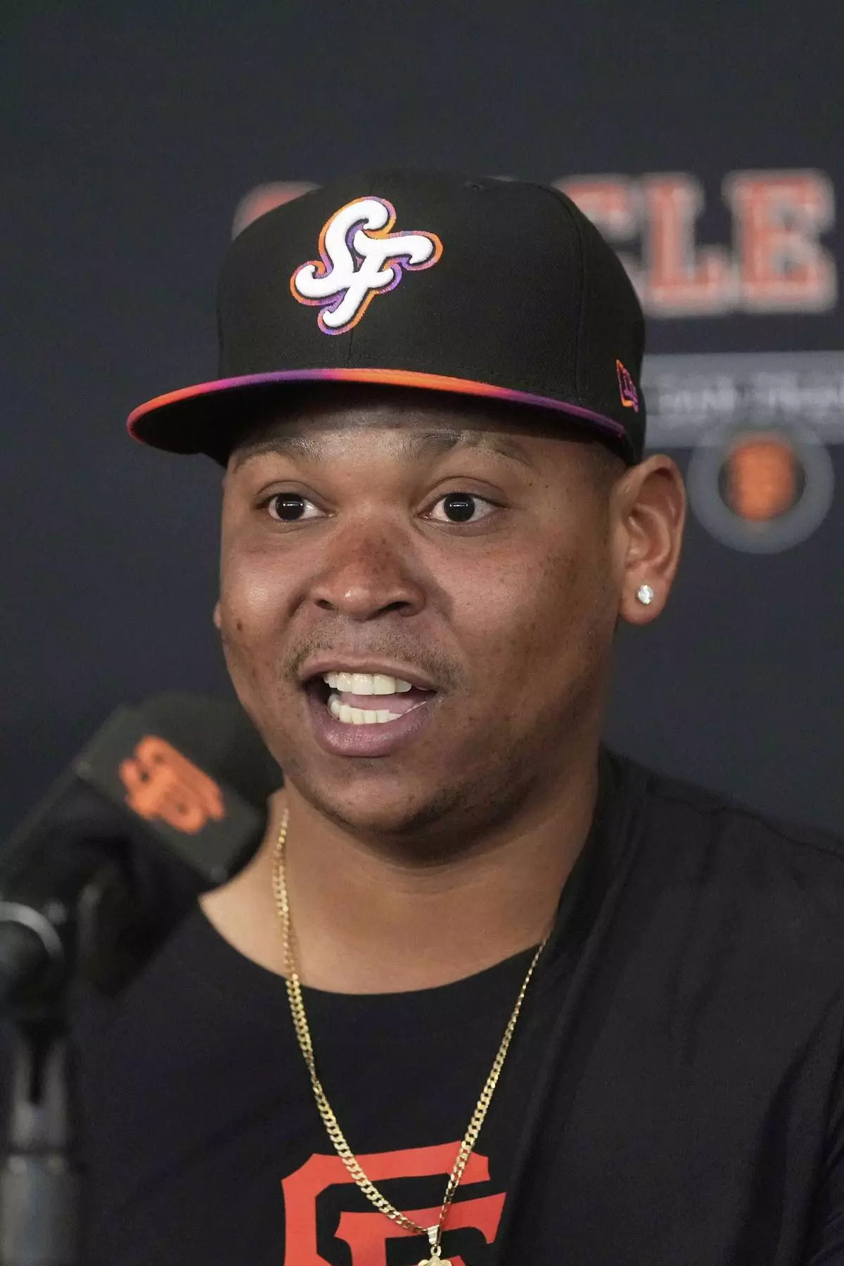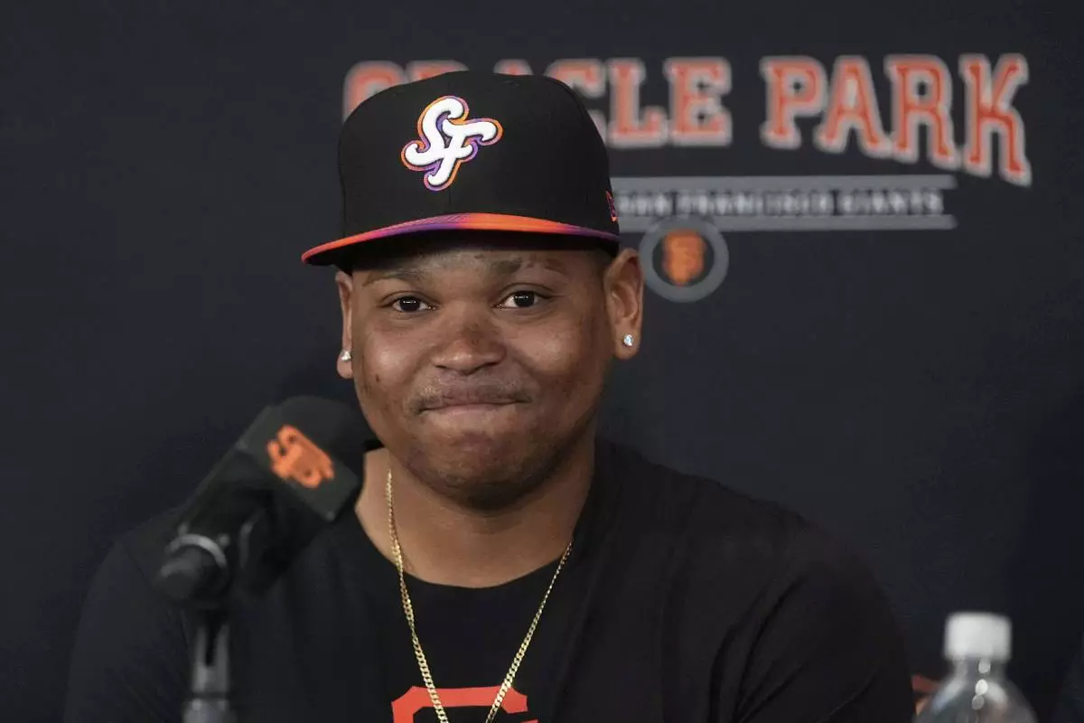 San Francisco Giants' Rafael Devers speaks at a news conference before a baseball game against the Cleveland Guardians in San Francisco, Tuesday, June 17, 2025. (AP Photo/Jeff Chiu)