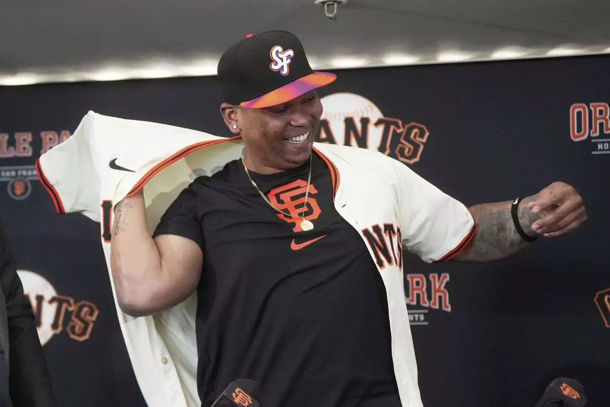 San Francisco Giants' Rafael Devers puts on a jersey at a news conference before a baseball game against the Cleveland Guardians in San Francisco, Tuesday, June 17, 2025. (AP Photo/Jeff Chiu)