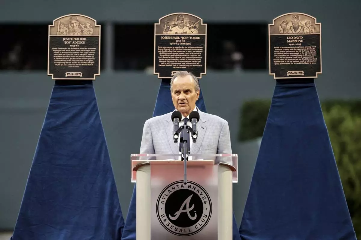 FILE - Joseph Paul "Joe" Torre speaks as he is inducted into the Braves Hall of Fame before the baseball game between the Atlanta Braves and the Arizona Diamondbacks Saturday, July 30, 2022, in Atlanta. (AP Photo/Butch Dill,File)