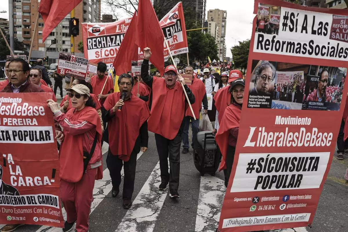 People participate in a march called by the central labor unions in support of Colombian President Gustavo Petro's intention to call by decree a popular consultation on labor reform in Bogota, Colombia, Wednesday, June 11, 2025. (AP Photo/Ivan Valencia)