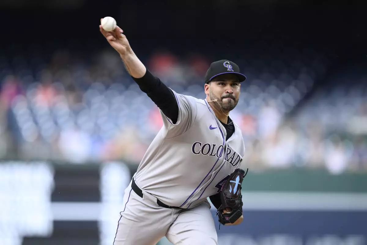 Colorado Rockies starting pitcher Antonio Senzatela throws during the first inning of a baseball game against the Washington Nationals, Tuesday, June 17, 2025, in Washington. (AP Photo/Nick Wass)