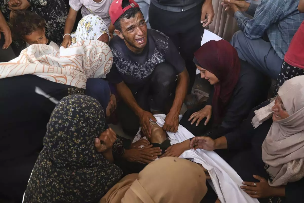 Palestinian relatives mourn over the body of a man killed in an Israeli strike, at Nasser Hospital in Khan Younis, southern Gaza Strip, Tuesday, June 17, 2025. (AP Photo/Mariam Dagga)