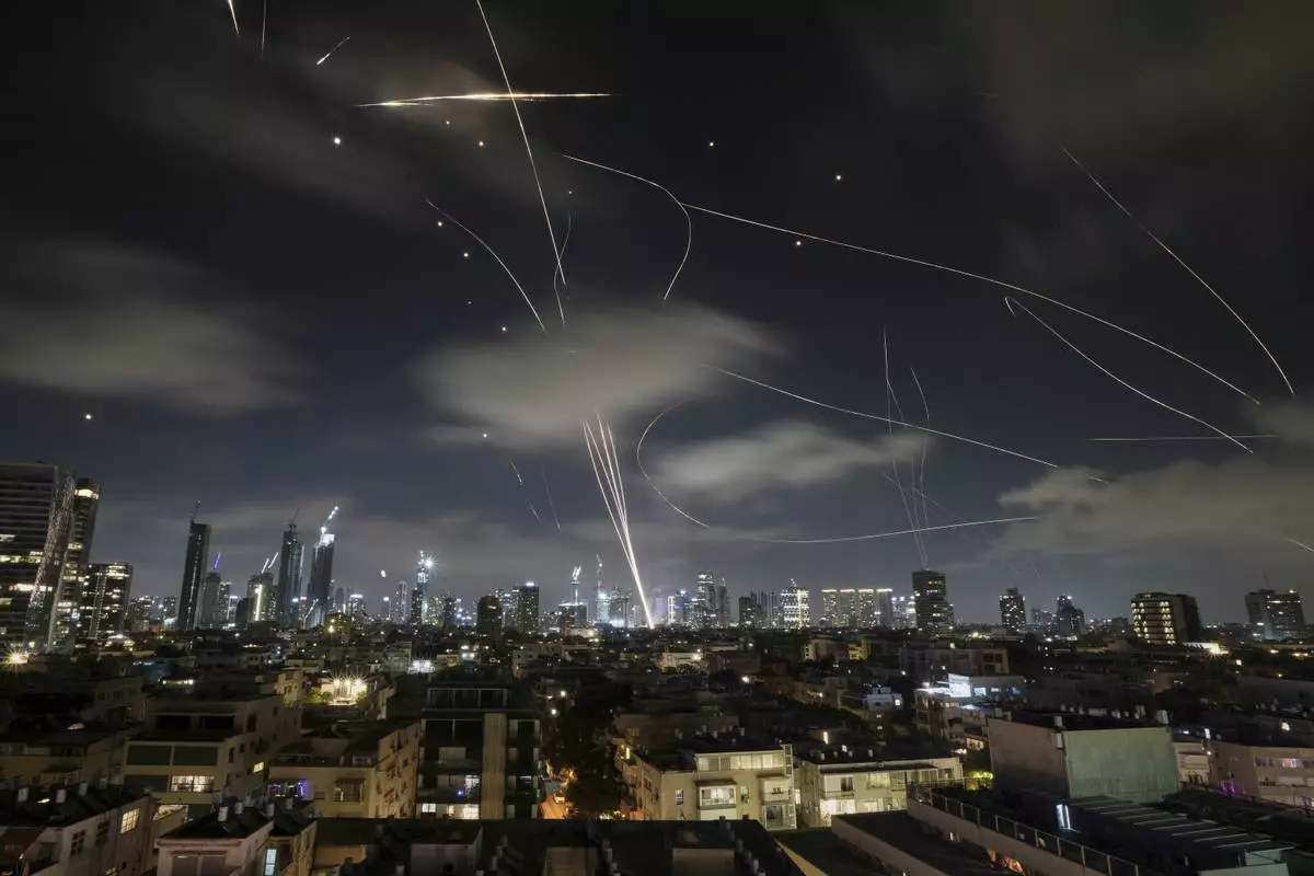 The Israeli Iron Dome air defense system fires to intercept missiles during an Iranian attack over Tel Aviv, Israel, early Wednesday, June 18, 2025. (AP Photo/Leo Correa)