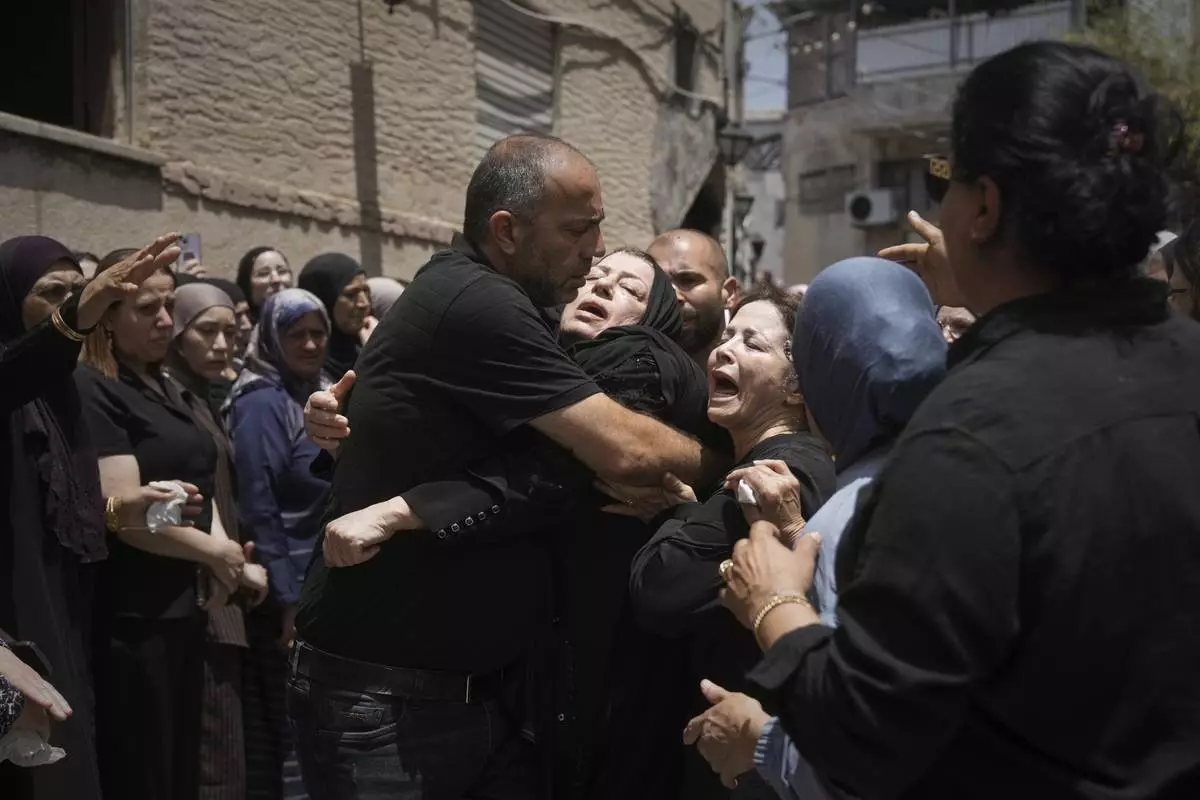 Relatives attend the funeral of four members of the Khatib family, Palestinian citizens of Israel killed in an Iranian missile strike on Tamra, Israel, on Tuesday, June 17, 2025. (AP Photo/Mahmoud Illean)