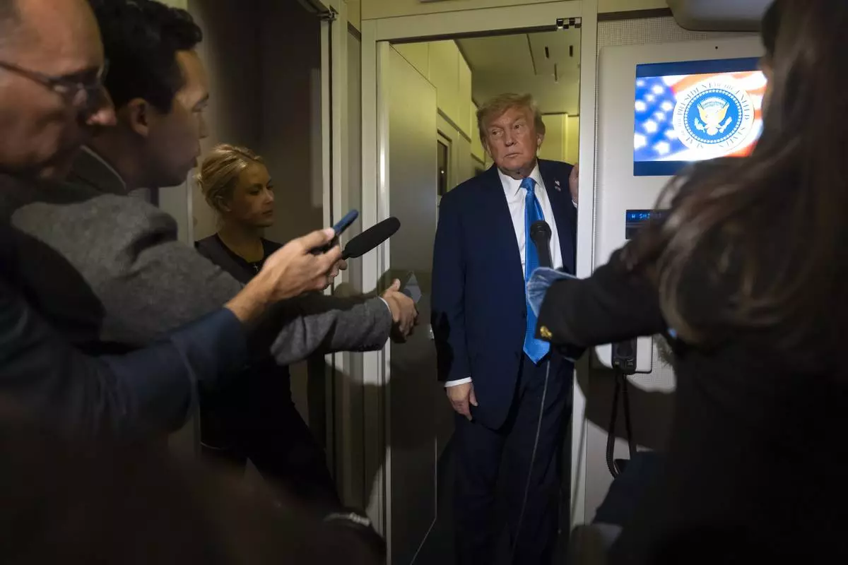 President Donald Trump speaks with reporters while flying aboard Air Force One en route from Calgary, Canada to Joint Base Andrews, Md., late Monday, June 16, 2025. (AP Photo/Mark Schiefelbein)