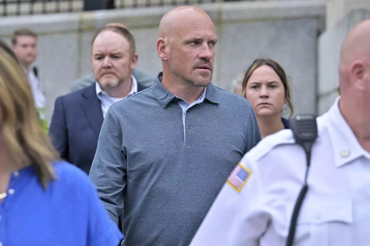 Paul O'Keefe, brother of John O'Keefe, looks toward Karen Read as they leave the courthouse at the start of the third day of jury deliberations in Read's trial at Norfolk Superior Court, Wednesday, June 18, 2025, in Dedham, Mass. (AP Photo/Josh Reynolds)