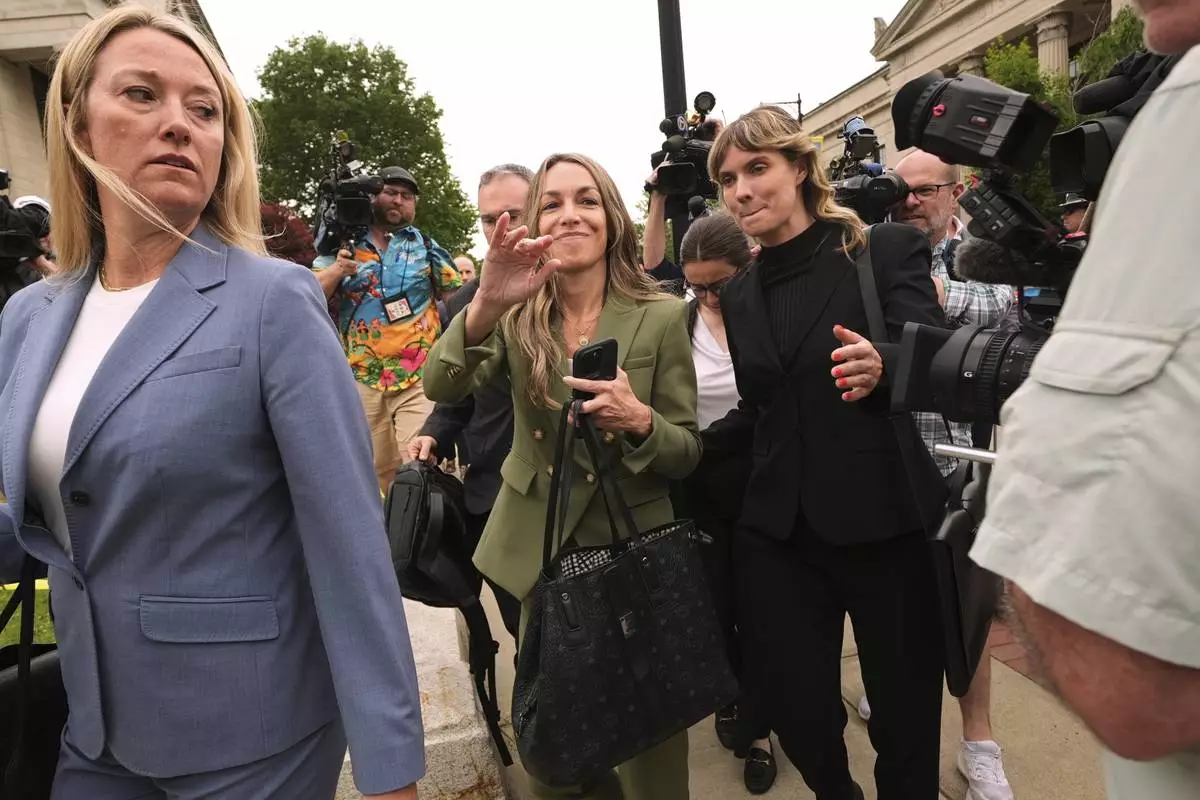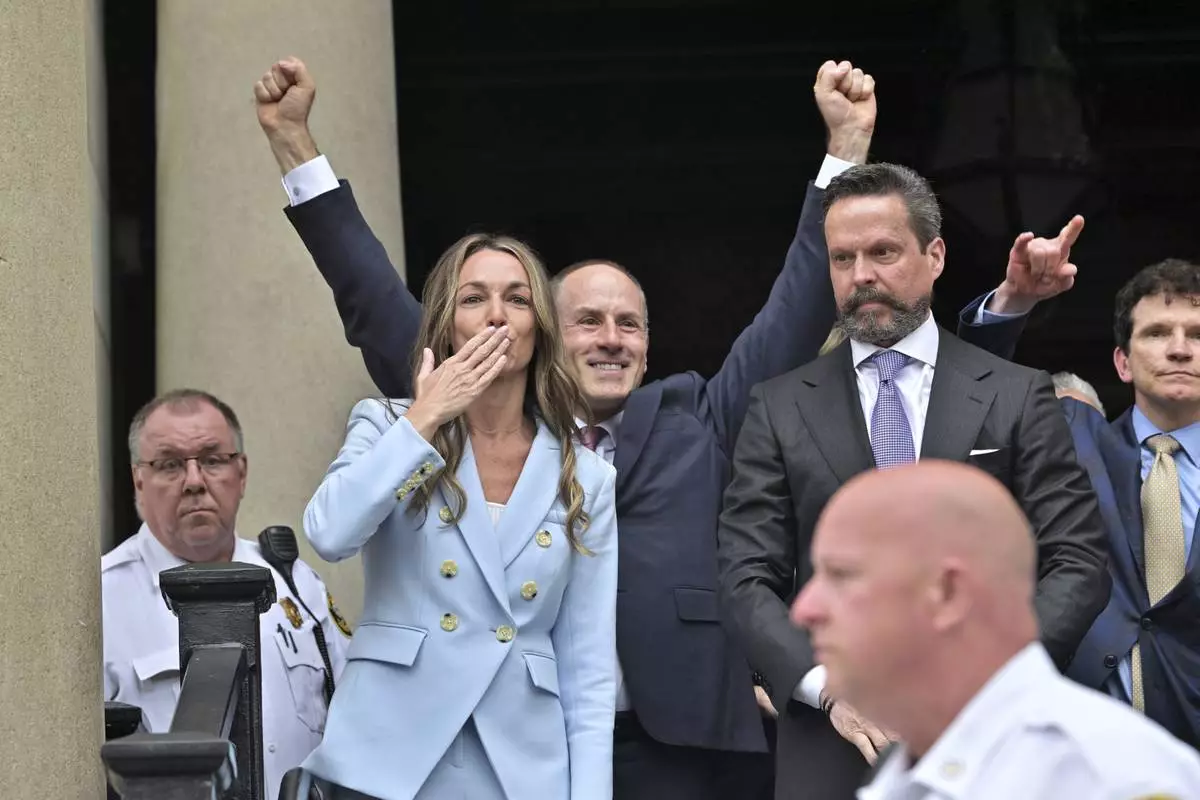 Karen Read, center, waves to supporters after she was found not guilty of second-degree murder on Wednesday, June 18, 2025, in Dedham, Mass. (AP Photo/Josh Reynolds)