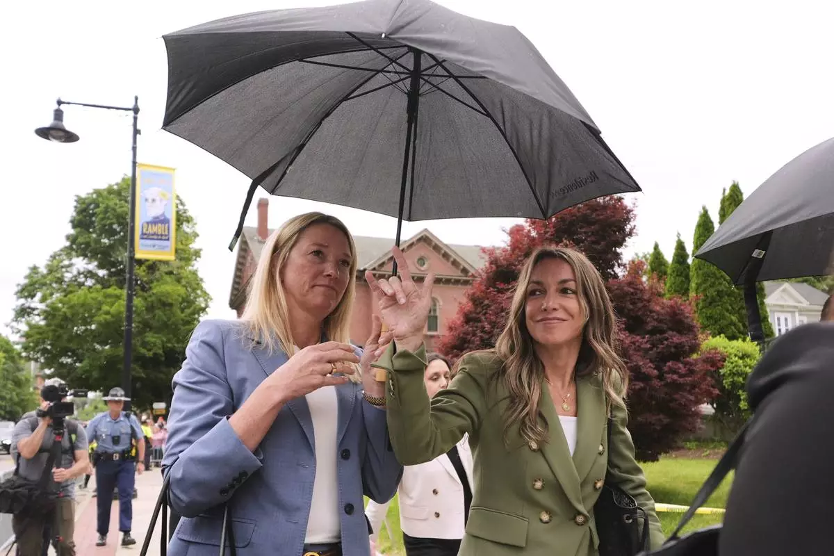 Blogger Aidan Kearney, center, meets with fans and Karen Read supporters, from left, Linda Allen of Rockland, MA, and Shannon LoPorto of Weymouth, MA, outside the Dedham, Mass. courthouse on the third day of jury deliberations in Read's trial at Norfolk Superior Court, Wednesday, June 18, 2025, in Dedham, Mass. (AP Photo/Josh Reynolds)