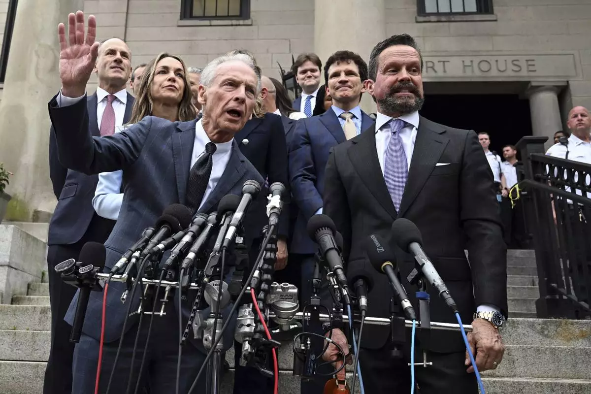 William Read, left, father of Karen Read, behind him, speaks after she was found not guilty of second-degree murder on Wednesday, June 18, 2025, in Dedham, Mass. (AP Photo/Josh Reynolds)