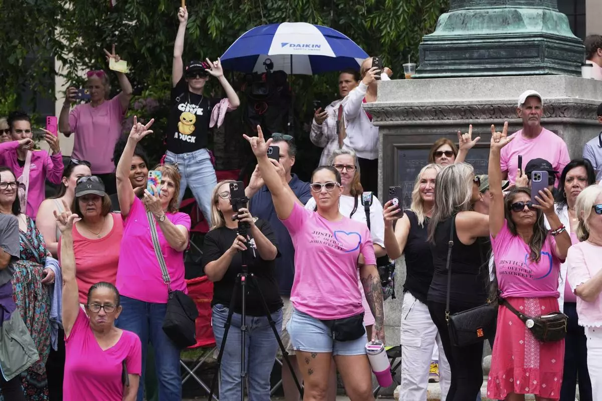 Supporters of Karen Read gesture as Read departs Norfolk Superior Court for the day during jury deliberations at her trial, Tuesday, June 17, 2025, in Dedham, Mass. (AP Photo/Charles Krupa)