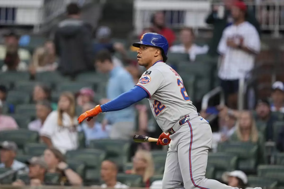 New York Mets' Juan Soto (22) watches his solo home run in the first inning of a baseball game against the Atlanta Braves, Tuesday, June 17, 2025, in Atlanta. (AP Photo/Brynn Anderson)