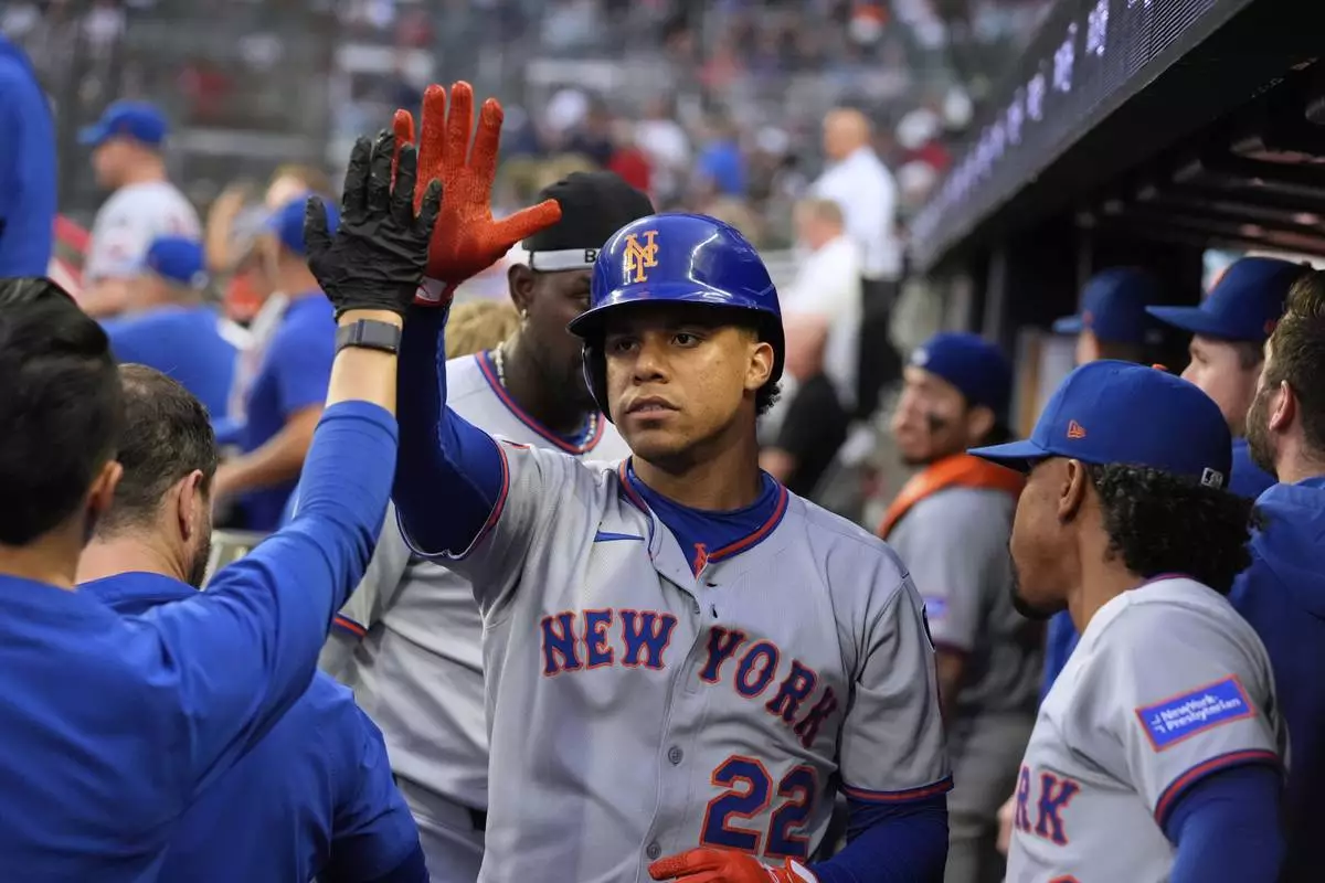 New York Mets' Juan Soto, left, Ronny Mauricio, middle, and Francisco Lindor, right, celebrate Soto's solo home run in the first inning of a baseball game against the Atlanta Braves, Tuesday, June 17, 2025, in Atlanta. (AP Photo/Brynn Anderson)