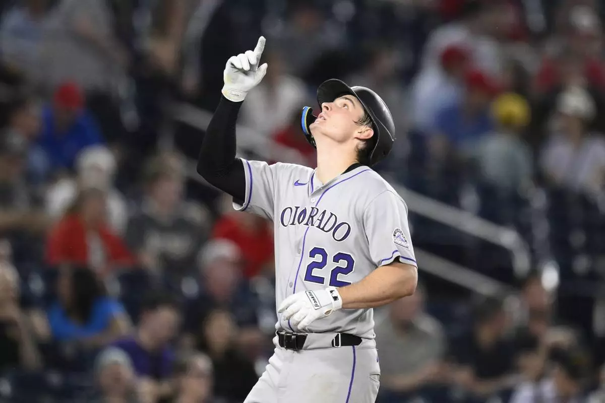 Colorado Rockies' Mickey Moniak celebrates his home run during the eighth inning of a baseball game against the Washington Nationals, Tuesday, June 17, 2025, in Washington. (AP Photo/Nick Wass)