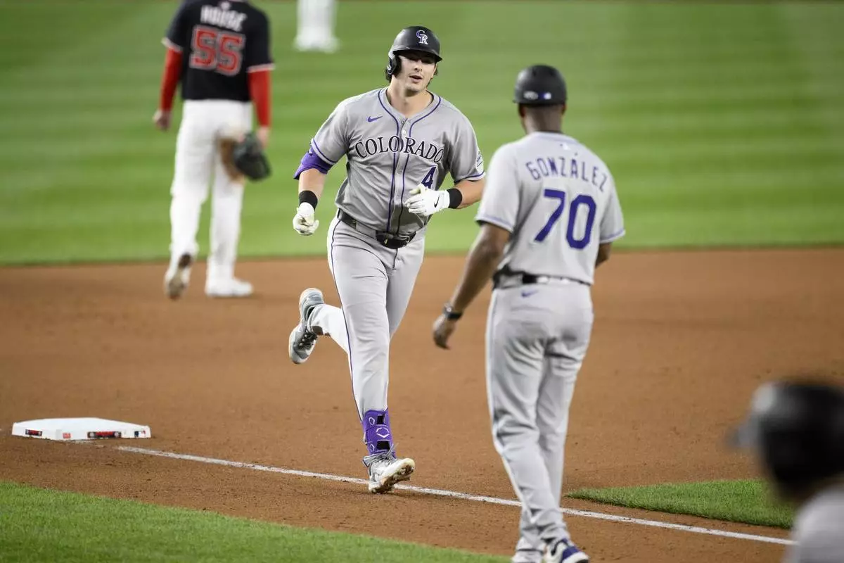 Colorado Rockies' Michael Toglia (4) rounds the bases on his home run next to third base coach Andy González (70) during the seventh inning of a baseball game against the Washington Nationals, Tuesday, June 17, 2025, in Washington. (AP Photo/Nick Wass)
