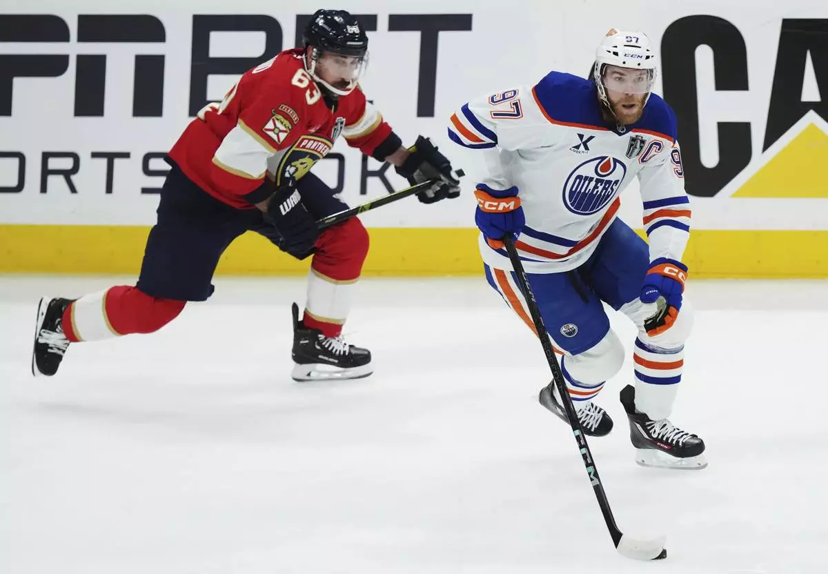 Florida Panthers' Brad Marchand (63) chases Edmonton Oilers' Connor McDavid (97) during the first period in Game 6 of the NHL hockey Stanley Cup Final in Sunrise, Fla., Tuesday, June 17, 2025. (Nathan Denette/The Canadian Press via AP)