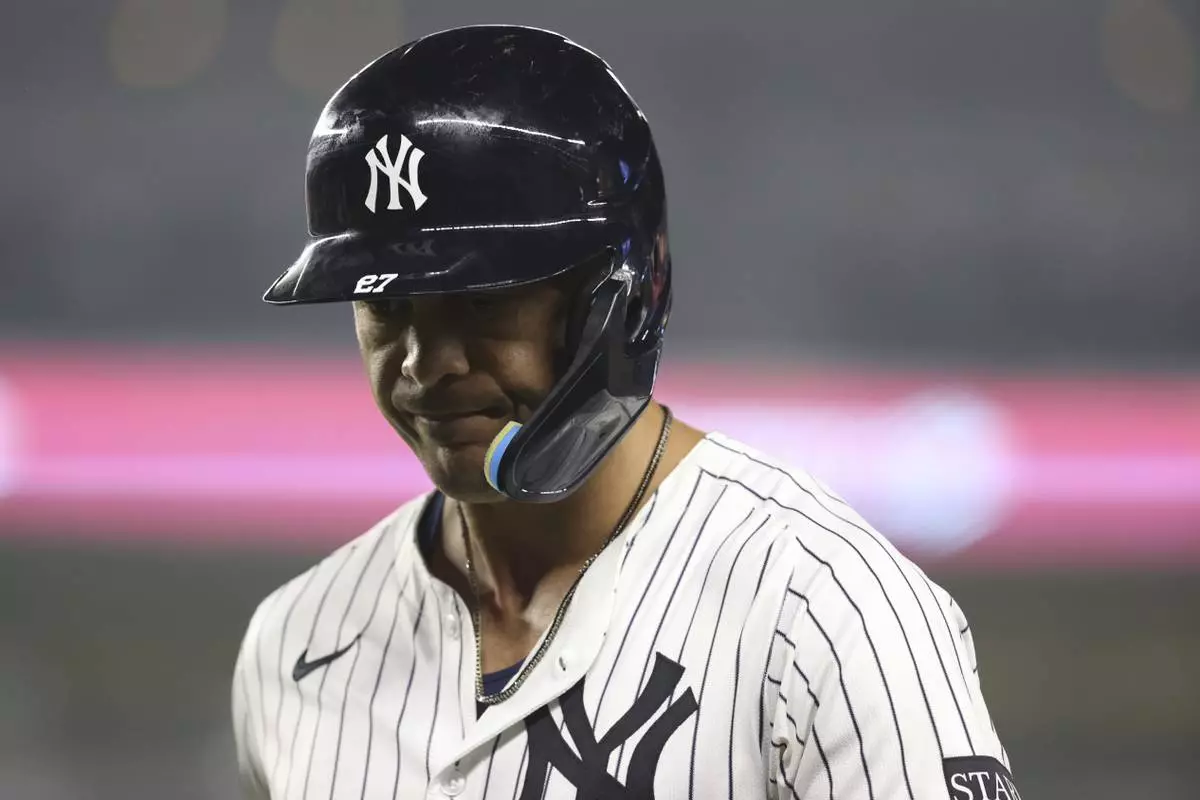 New York Yankees' Giancarlo Stanton walks to the dugout after flying out to Los Angeles Angels shortstop Zach Neto during the ninth inning of a baseball game Tuesday, June 17, 2025, in New York. (AP Photo/Pamela Smith)