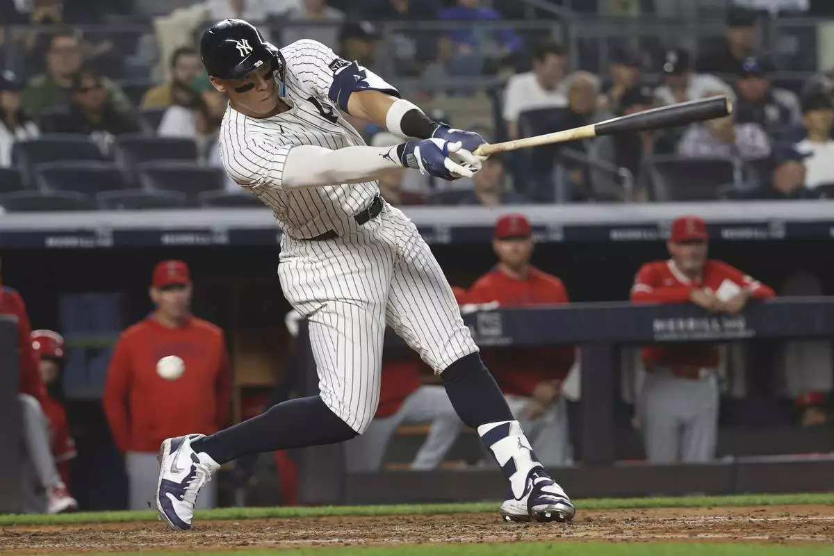 New York Yankees' Aaron Judge bats during the third inning of a baseball game against the Los Angeles Angels, Tuesday, June 17, 2025, in New York. (AP Photo/Pamela Smith)