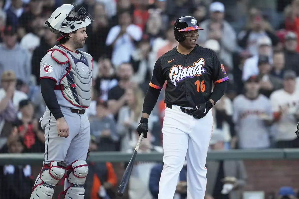 San Francisco Giants' Rafael Devers (16) smiles as he walks to the plate next to Cleveland Guardians catcher Austin Hedges during the first inning of a baseball game in San Francisco, Tuesday, June 17, 2025. (AP Photo/Jeff Chiu)