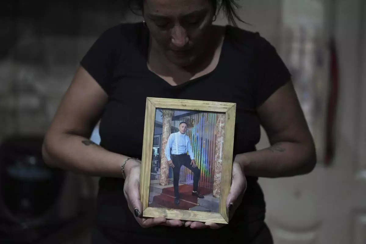 Claudia Caballero poses with a photo of her late son Alexis Almiron, a cancer patient who tried to get medication that had been covered by federal agency DADSE, but which President Javier Milei dissolved, in the outskirts of Buenos Aires, Argentina, Monday, May 5, 2025. (AP Photo/Natacha Pisarenko)