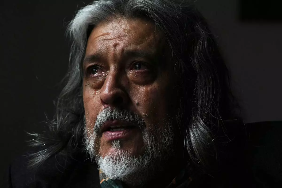 Eduardo Castano sheds tears while thinking about his wife Marité, who died in 2024, unable to secure drugs that had been covered by the federal agency DADSE, which President Javier Milei dissolved, in Buenos Aires, Argentina, Wednesday, April 16, 2025. (AP Photo/Natacha Pisarenko)