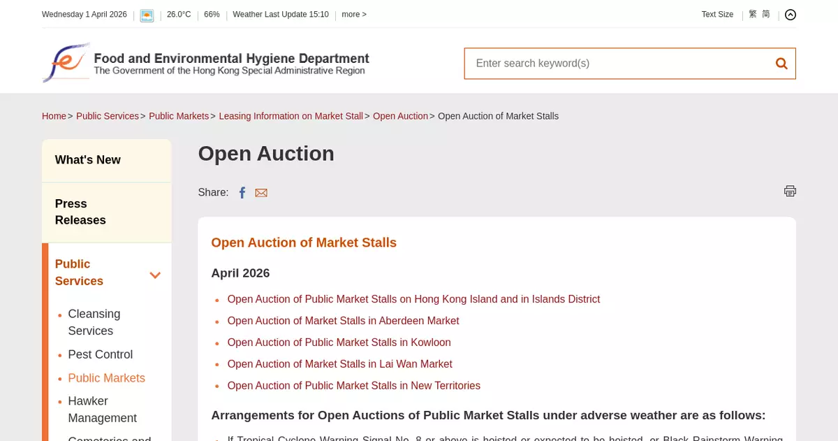 The Food and Environmental Hygiene Department (FEHD) announced today (April 1) that open auctions for a total of 501 stalls in 45 public markets will be held in April. Market stalls not taken at open auctions will be available to the public for renting at their upset prices on April 24 on a first-come, first-served basis.