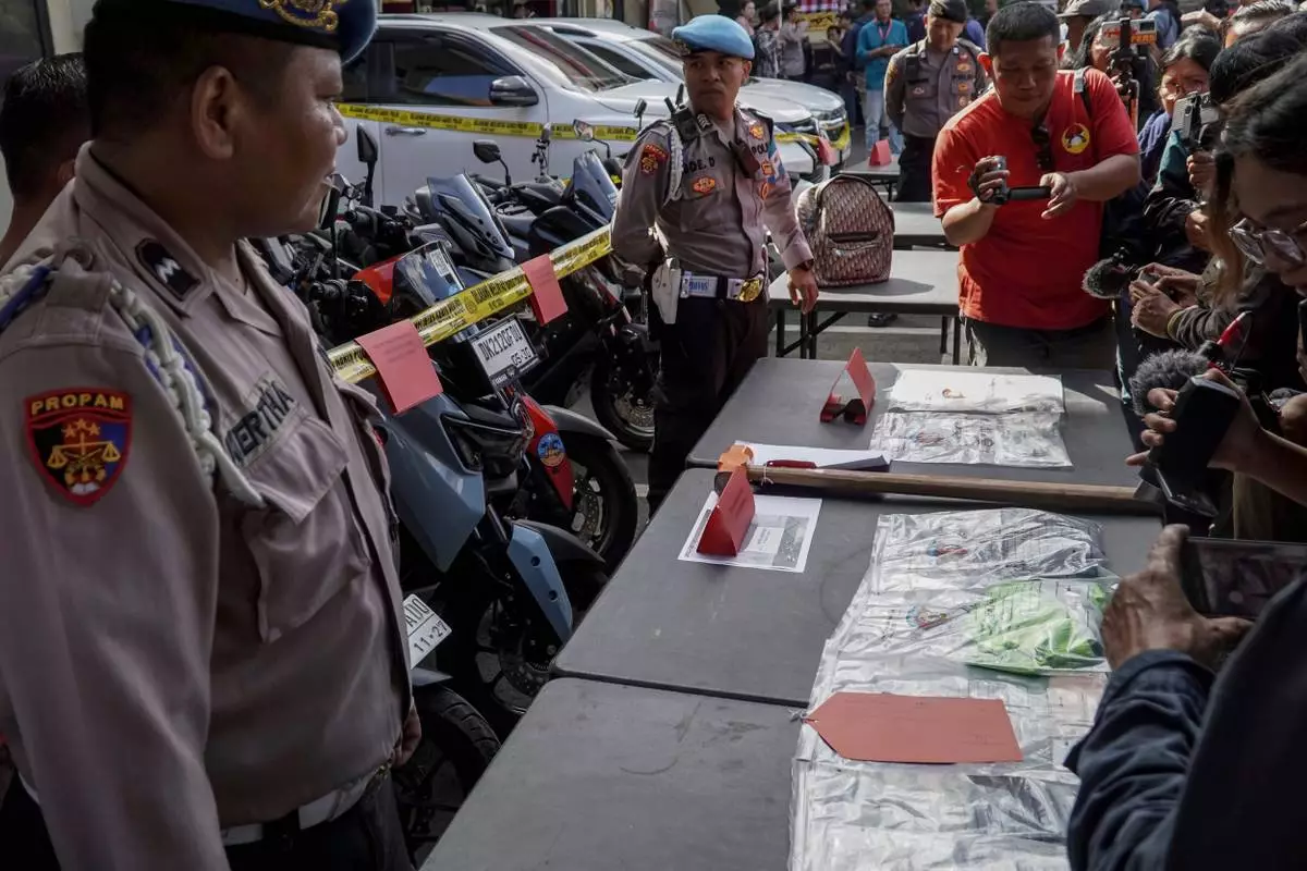 Police officers display evidence related to the fatal shooting of an Australian tourist during a press conference at the local police precinct in Badung, Bali, Indonesia, June 18, 2025. (AP Photo/Herdyanto)