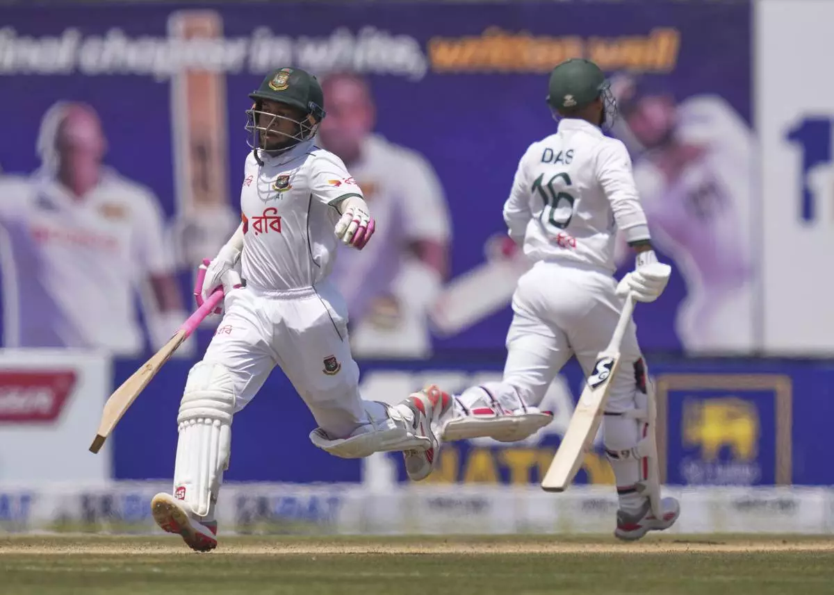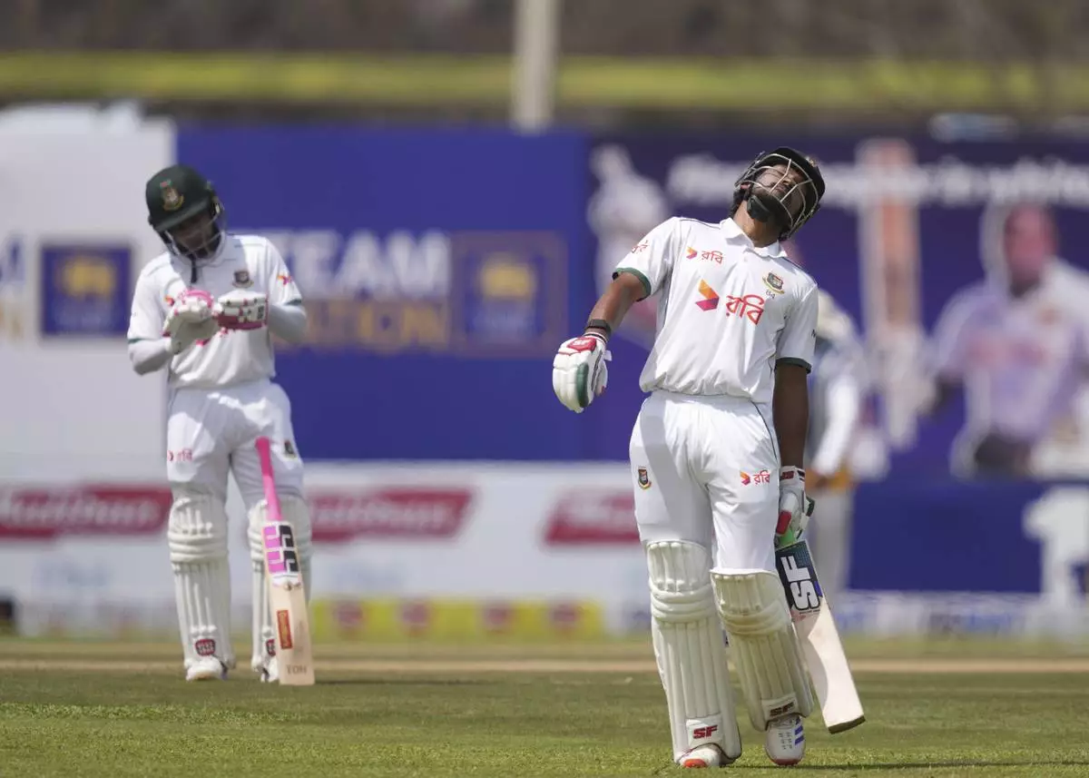 Bangladesh's captain Najmul Hossain Shanto, right, leaves the ground after losing his wicket as Mushfiqur Rahim watches during the second day of the first cricket test match between Sri Lanka and Bangladesh in Galle, Sri Lanka, Wednesday, June 18, 2025. (AP Photo/Eranga Jayawardena)