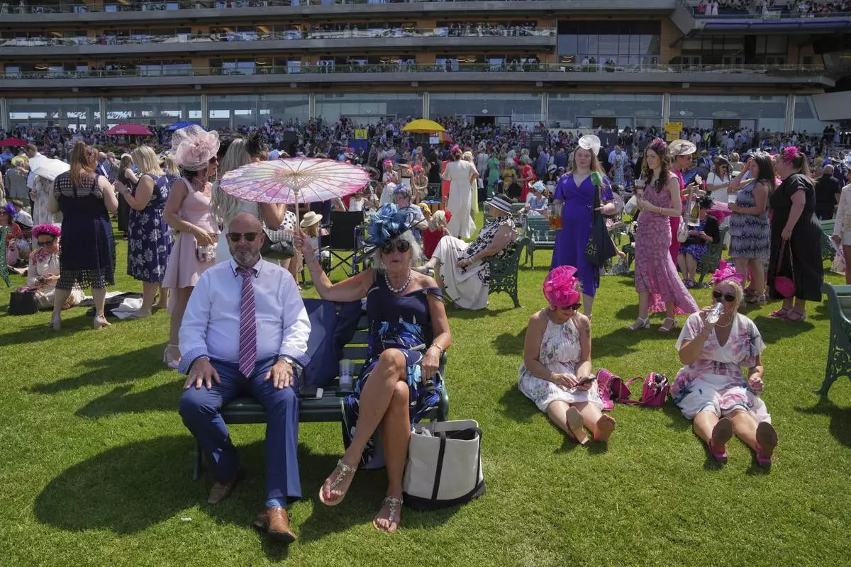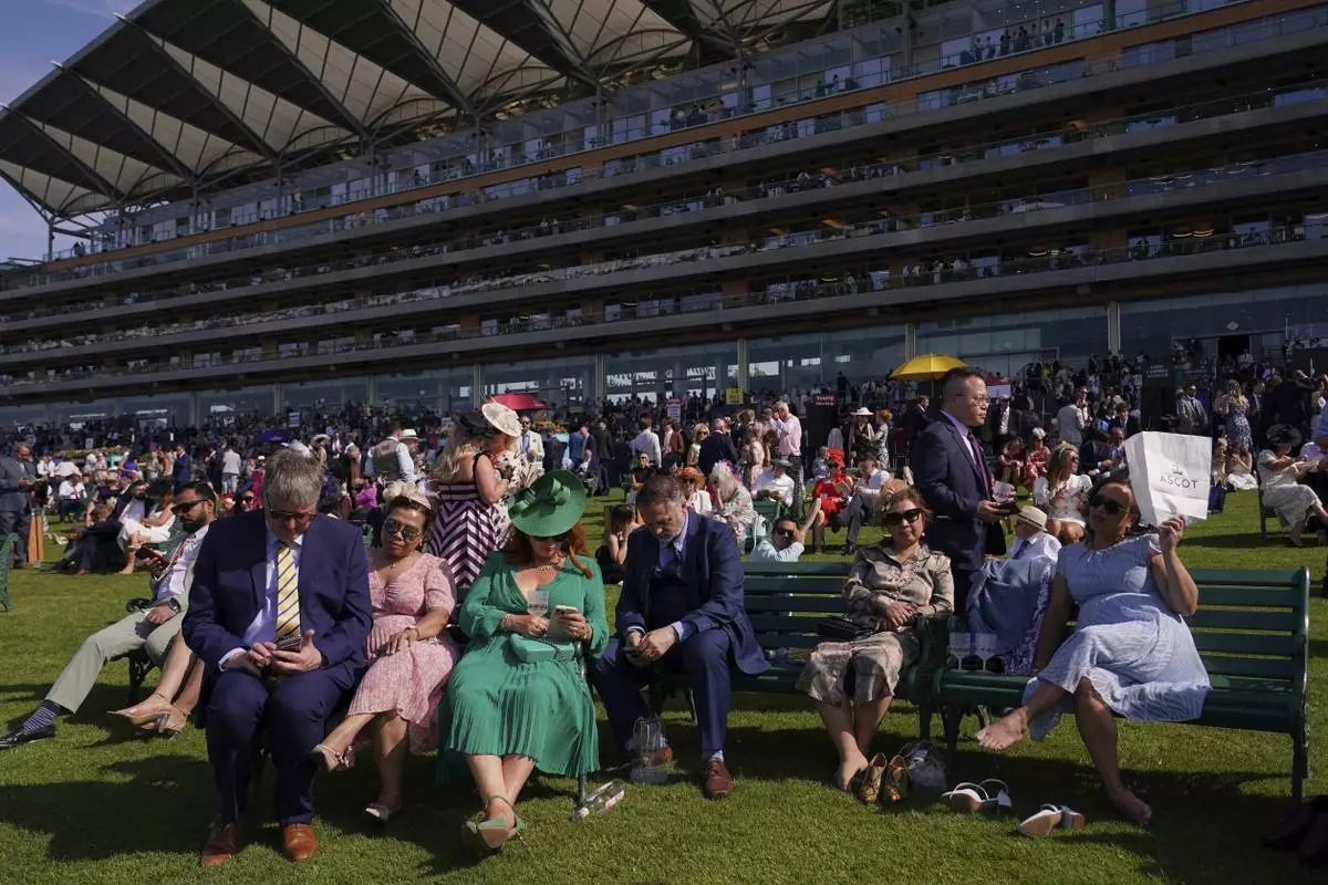 Racegoers enjoy the warm weather as they watch the racing on the first day of the Royal Ascot horse race meeting at Ascot, England, Tuesday, June 17, 2025. (AP Photo/Alberto Pezzali)