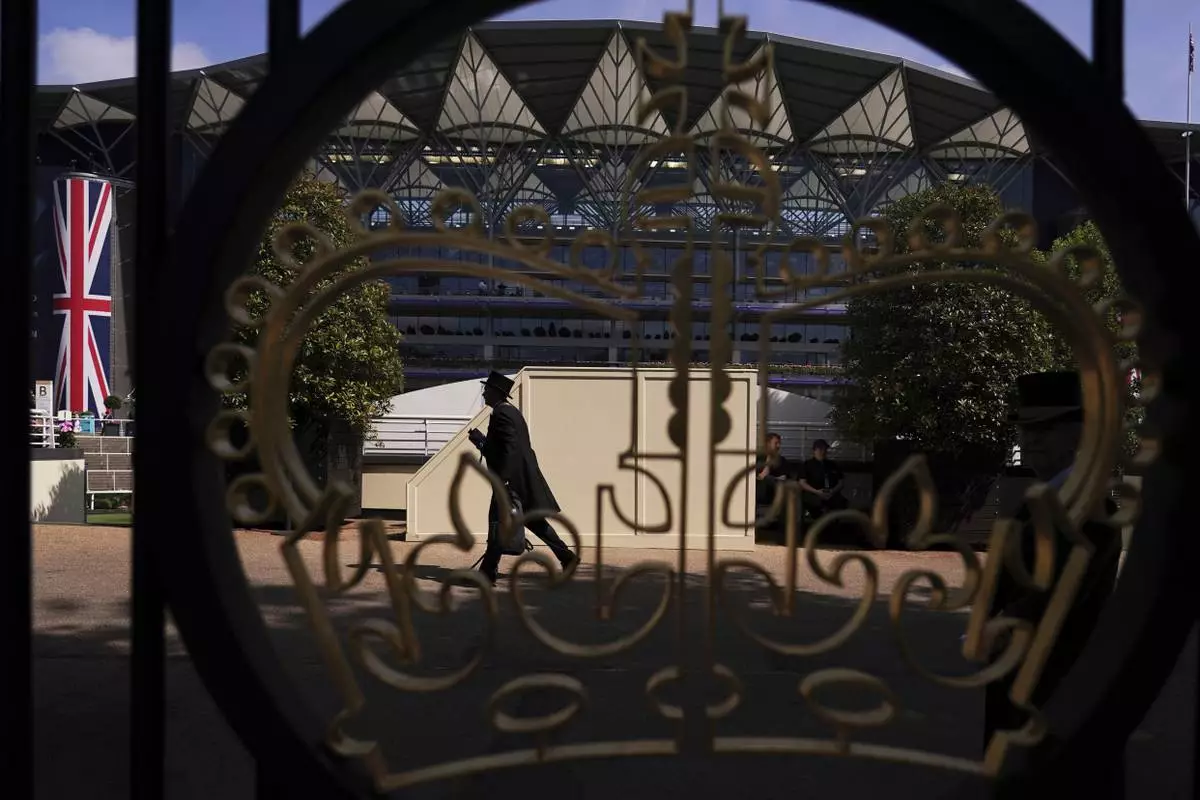 A view of the stands seen through a gold painted crown entrance gate on the second day of the Royal Ascot horse race meeting at Ascot, England, Wednesday June 18, 2025. (AP Photo/Alberto Pezzali) (AP Photo/Alberto Pezzali)