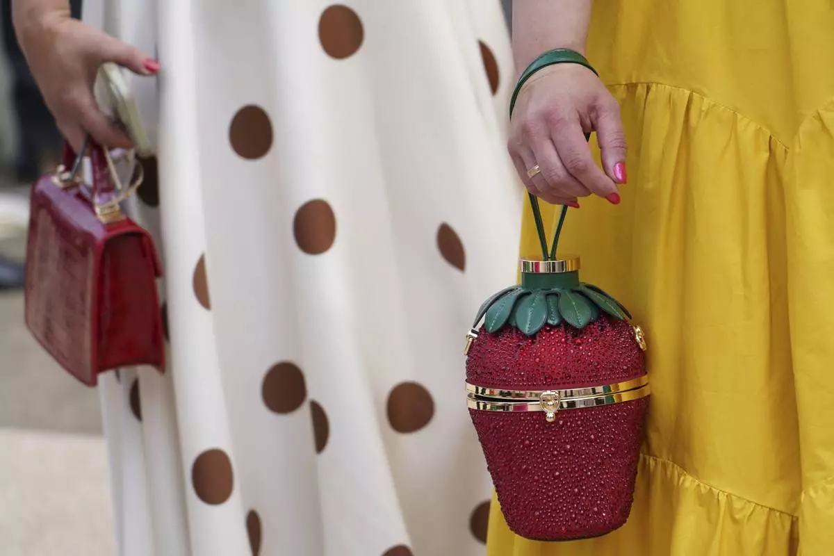 A racegoers carries a strawberry themed handbag as she arrive on the first day of the Royal Ascot horse race meeting at Ascot, England, Tuesday, June 17, 2025. (AP Photo/Alberto Pezzali)