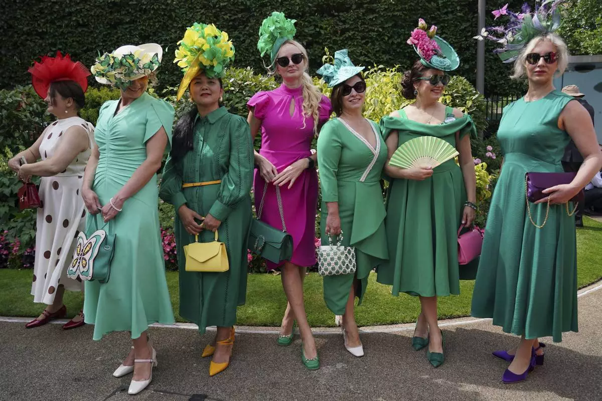 Racegoers wearing colorful outfits pose for photographs as they arrive on the first day of the Royal Ascot horse race meeting at Ascot, England, Tuesday, June 17, 2025. (AP Photo/Alberto Pezzali)