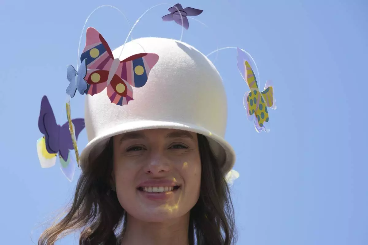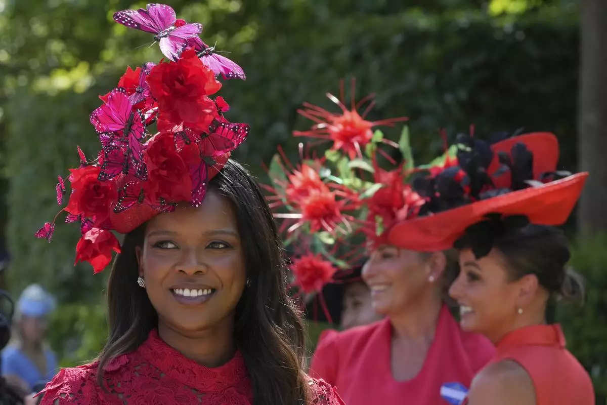 Demean Spucyte smiles as she wear a butterfly themed has on the third day of the Royal Ascot horse race meeting, traditionally called Ladies Day, at Ascot, England, Thursday, June 19, 2025. (AP Photo/kKn Cheung)