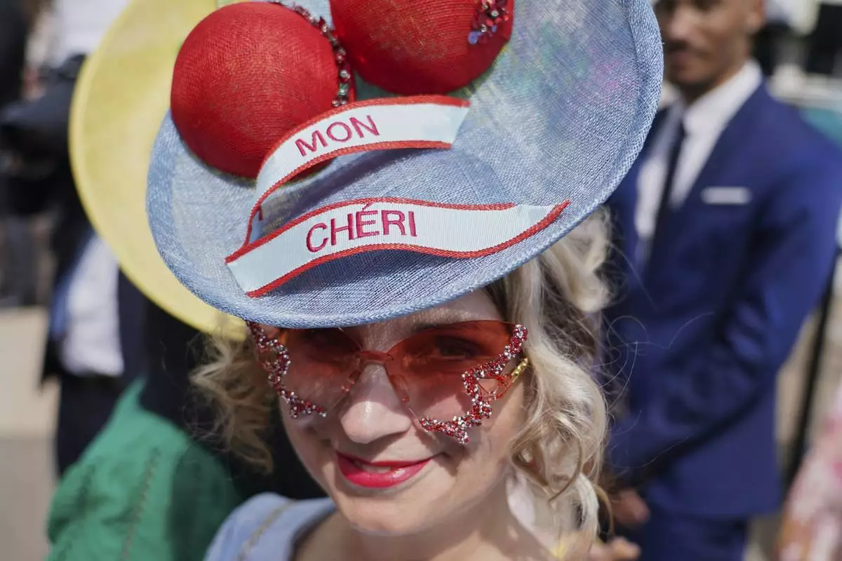 Racegoers wear ornate hast as they walk towards the Royal Enclosure on the third day of the Royal Ascot horse race meeting, traditionally called Ladies Day, at Ascot, England, Thursday, June 19, 2025. (AP Photo/kKn Cheung)