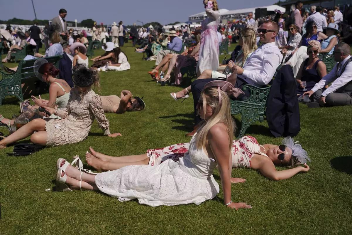 Racegoers relax in the sunshine between races as temperatures rise to over 30c (86f), on the third day of the Royal Ascot horse race meeting, traditionally called Ladies Day, at Ascot, England, Thursday, June 19, 2025. (AP Photo/Kin Cheung)