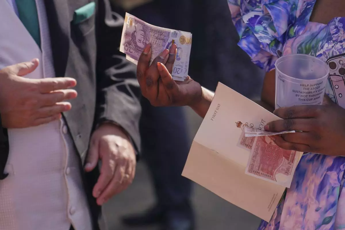 People take money out as they place bets on the races on the first day of the Royal Ascot horse race meeting at Ascot, England, Tuesday, June 17, 2025. (AP Photo/Alberto Pezzali)
