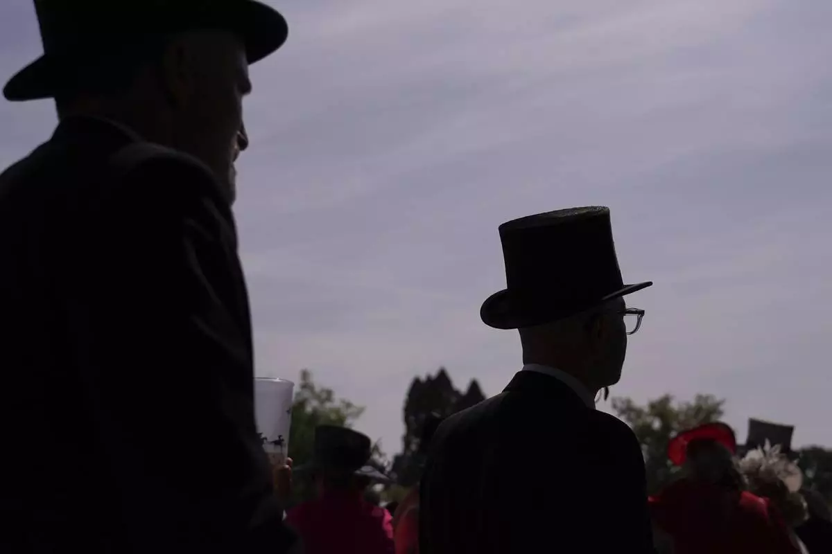 Men wearing top hats watch the races on the first day of the Royal Ascot horse race meeting at Ascot, England, Tuesday, June 17, 2025. (AP Photo/Alberto Pezzali)