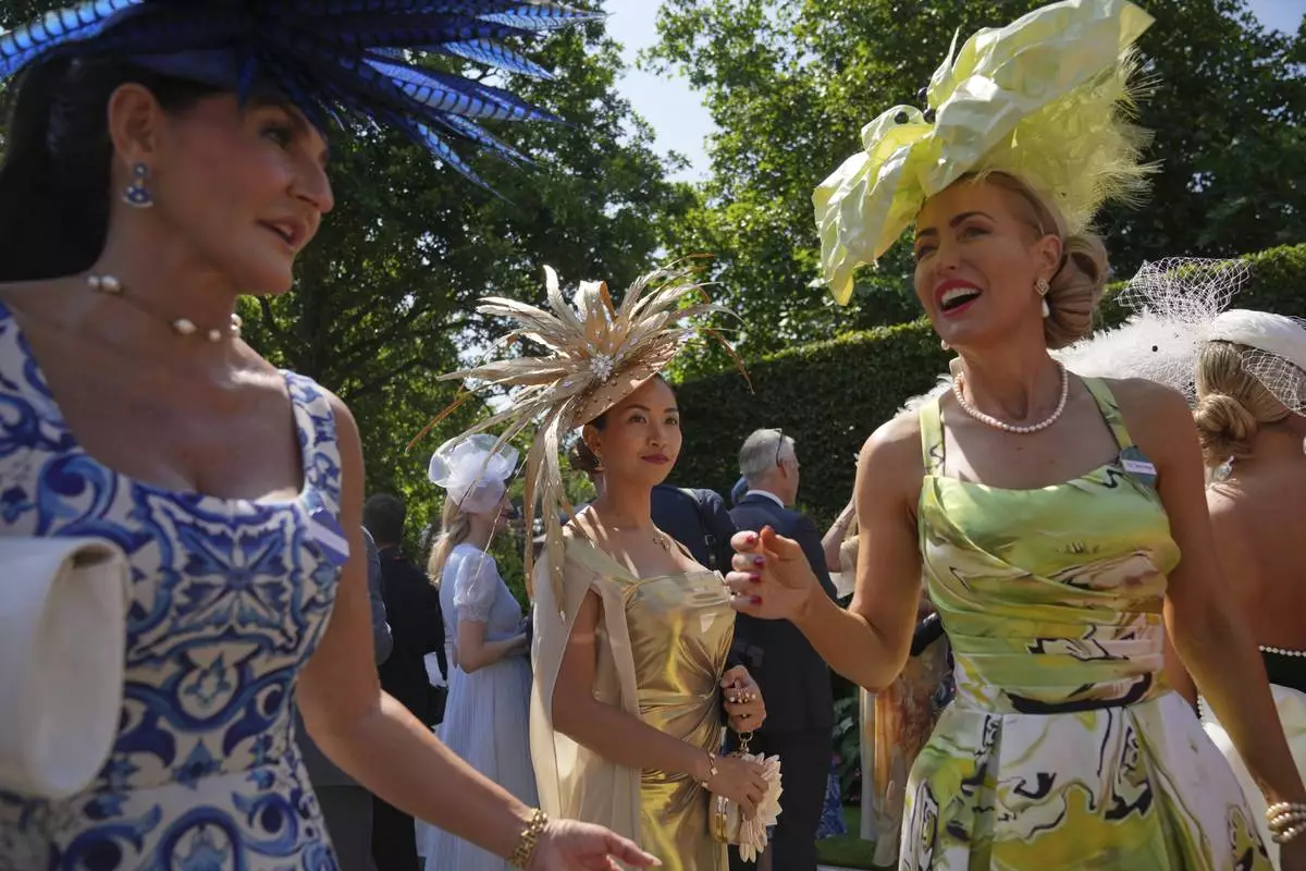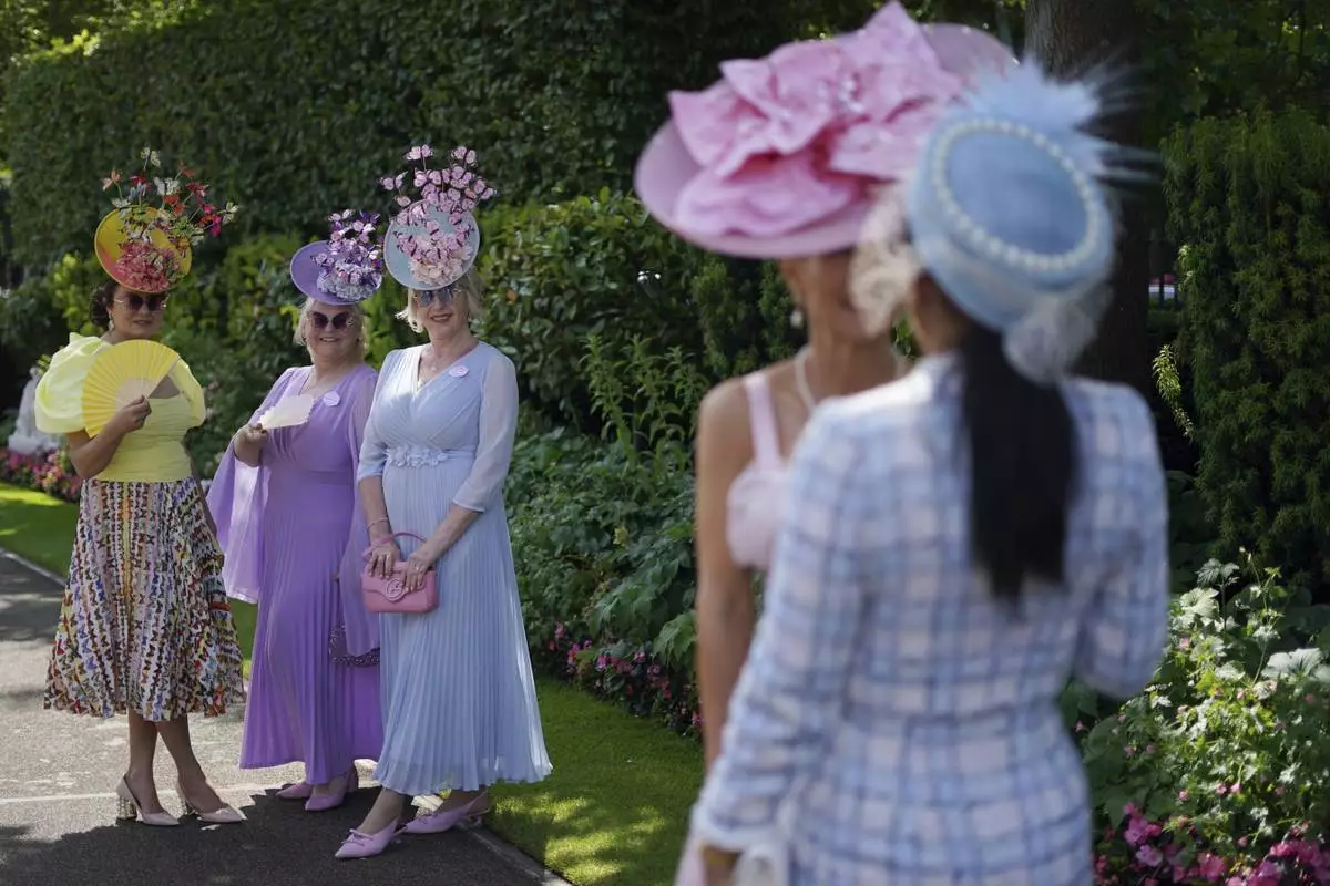 Ladies arrive wearing ornate hats on the third day of the Royal Ascot horse race meeting, traditionally called Ladies Day, at Ascot, England, Thursday, June 19, 2025. (AP Photo/kKn Cheung)