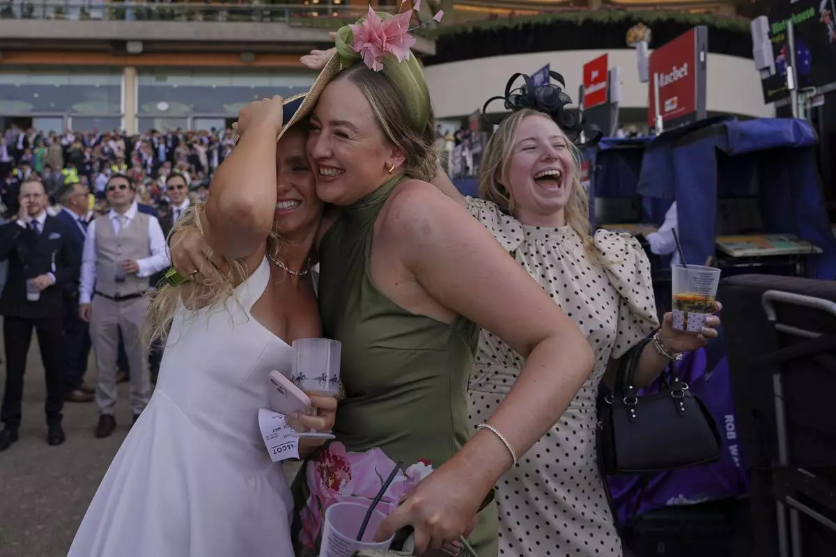 Racegoers celebrate in the public enclosure on the second day of the Royal Ascot horse race meeting at Ascot, England, Wednesday June 18, 2025. (AP Photo/Alberto Pezzali)